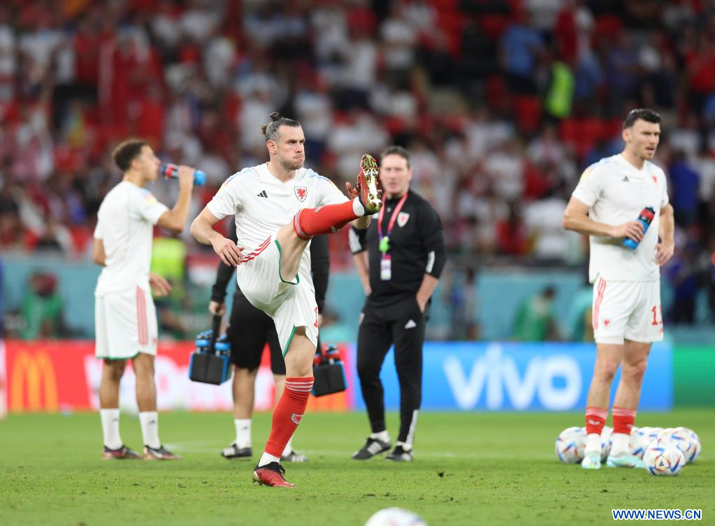 AL RAYYAN, 29 noviembre, 2022 (Xinhua) -- Gareth Bale (d), de Gales, calienta previo al partido correspondiente al Grupo B entre Gales e Inglaterra en la Copa Mundial de la FIFA 2022, en el Estadio Ahmad Bin Ali, en Al Rayyan, Qatar, el 29 de noviembre de 2022. (Xinhua/Li Ming)