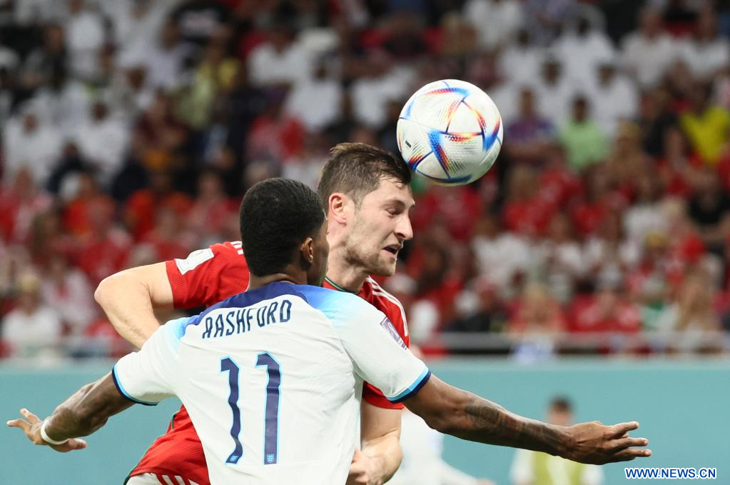 AL RAYYAN, 29 noviembre, 2022 (Xinhua) -- Ben Davies (d), de Gales, cabecea el balón durante el partido correspondiente al Grupo B entre Gales e Inglaterra en la Copa Mundial de la FIFA 2022, en el Estadio Ahmad Bin Ali, en Al Rayyan, Qatar, el 29 de noviembre de 2022. (Xinhua/Lan Hongguang)
