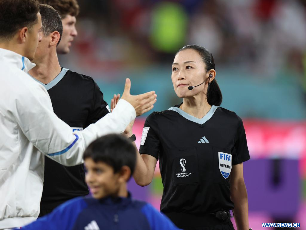 AL RAYYAN, 29 noviembre, 2022 (Xinhua) -- La cuarta oficial Yoshimi Yamashita (d) reacciona previo al partido correspondiente al Grupo B entre Gales e Inglaterra en la Copa Mundial de la FIFA 2022, en el Estadio Ahmad Bin Ali, en Al Rayyan, Qatar, el 29 de noviembre de 2022. (Xinhua/Li Ming)