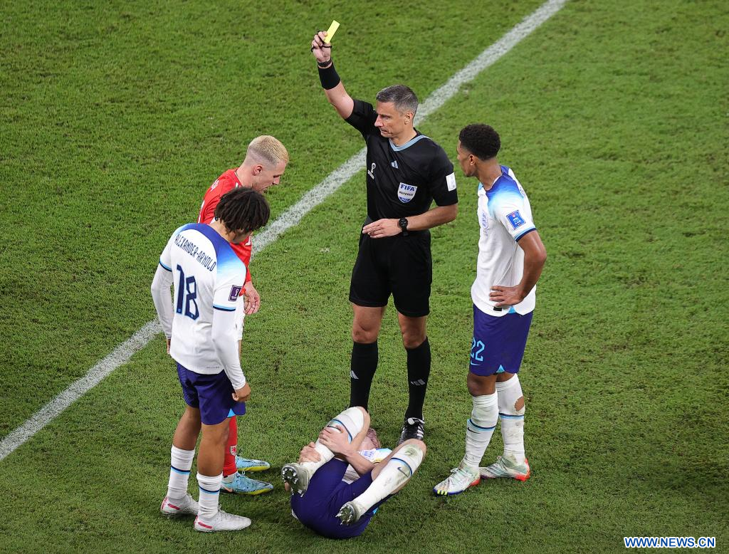 AL RAYYAN, 29 noviembre, 2022 (Xinhua) -- El árbitro Slavko Vincic (2-d), muestra una tarjeta amarilla a Aaron Ramsey, de Gales, durante el partido correspondiente al Grupo B entre Gales e Inglaterra en la Copa Mundial de la FIFA 2022, en el Estadio Ahmad Bin Ali, en Al Rayyan, Qatar, el 29 de noviembre de 2022. (Xinhua/Wang Dongzhen)
