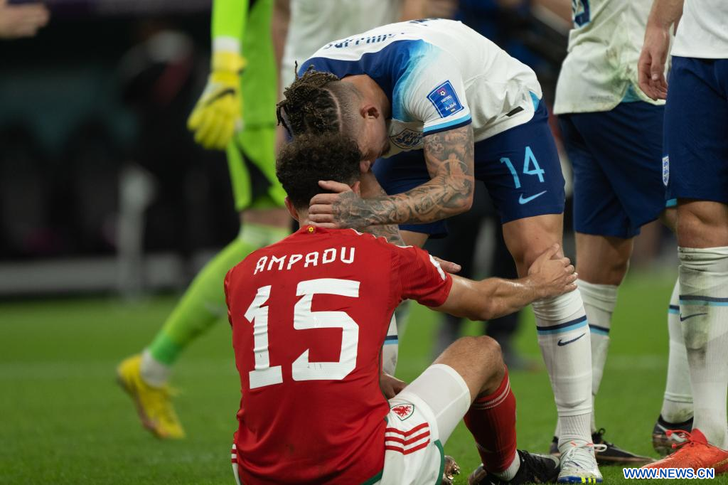 AL RAYYAN, 29 noviembre, 2022 (Xinhua) -- Kalvin Phillips (arriba), de Inglaterra, saluda a Ethan Ampadu, de Gales, después del partido correspondiente al Grupo B entre Gales e Inglaterra en la Copa Mundial de la FIFA 2022, en el Estadio Ahmad Bin Ali, en Al Rayyan, Qatar, el 29 de noviembre de 2022. (Xinhua/Xiao Yijiu)