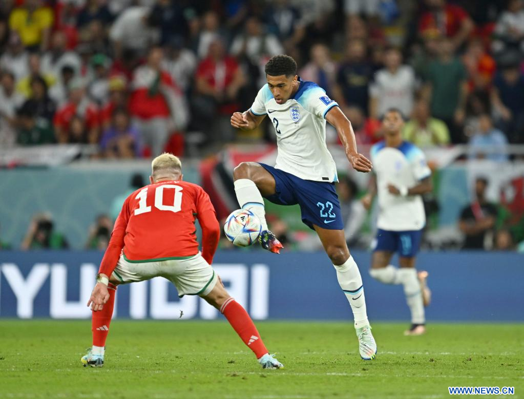 AL RAYYAN, 29 noviembre, 2022 (Xinhua) -- Jude Bellingham (d), de Inglaterra, compite durante el partido correspondiente al Grupo B entre Gales e Inglaterra en la Copa Mundial de la FIFA 2022, en el Estadio Ahmad Bin Ali, en Al Rayyan, Qatar, el 29 de noviembre de 2022. (Xinhua/Xiao Yijiu)