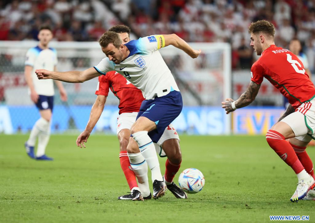 AL RAYYAN, 29 noviembre, 2022 (Xinhua) -- Harry Kane (frente), de Inglaterra, compite durante el partido correspondiente al Grupo B entre Gales e Inglaterra en la Copa Mundial de la FIFA 2022, en el Estadio Ahmad Bin Ali, en Al Rayyan, Qatar, el 29 de noviembre de 2022. (Xinhua/Lan Hongguang)