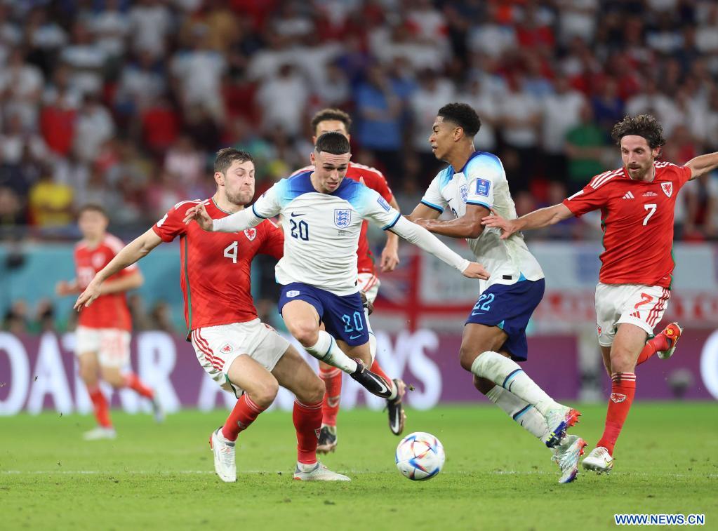 AL RAYYAN, 29 noviembre, 2022 (Xinhua) -- Phil Foden (2-i-frente), de Inglaterra, disputa el balón durante el partido correspondiente al Grupo B entre Gales e Inglaterra en la Copa Mundial de la FIFA 2022, en el Estadio Ahmad Bin Ali, en Al Rayyan, Qatar, el 29 de noviembre de 2022. (Xinhua/Li Ming)