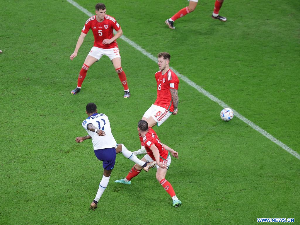 AL RAYYAN, 29 noviembre, 2022 (Xinhua) -- Marcus Rashford (2-d), de Inglaterra, dispara durante el partido correspondiente al Grupo B entre Gales e Inglaterra en la Copa Mundial de la FIFA 2022, en el Estadio Ahmad Bin Ali, en Al Rayyan, Qatar, el 29 de noviembre de 2022. (Xinhua/Wang Dongzhen)