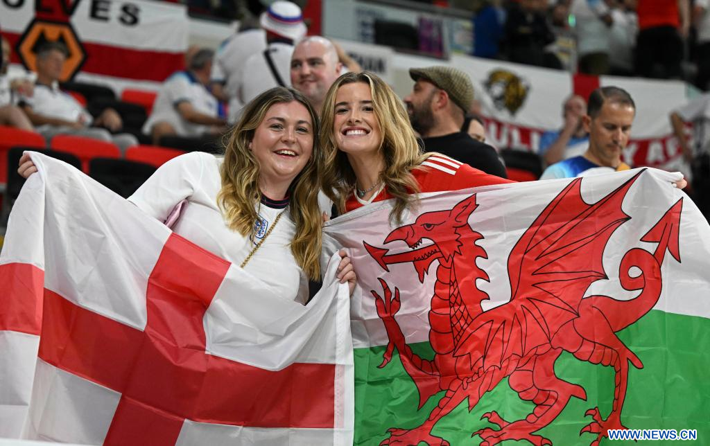 AL RAYYAN, 29 noviembre, 2022 (Xinhua) -- Aficionadas posan para fotografías previo al partido correspondiente al Grupo B entre Gales e Inglaterra en la Copa Mundial de la FIFA 2022, en el Estadio Ahmad Bin Ali, en Al Rayyan, Qatar, el 29 de noviembre de 2022. (Xinhua/Xiao Yijiu)