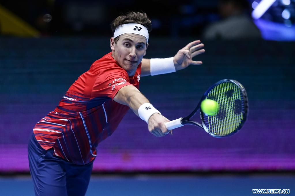 BOGOTA, 30 noviembre, 2022 (Xinhua) -- Imagen del 29 de noviembre de 2022 de Casper Ruud, de Noruega, devolviendo la pelota a Rafael Nadal, de España, durante un partido de exhibición en el Coliseo Live, en la ciudad de Bogotá, capital de Colombia. (Xinhua/Jhon Paz)