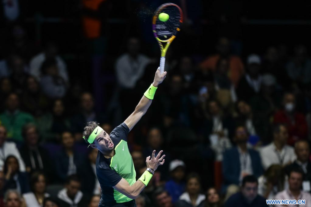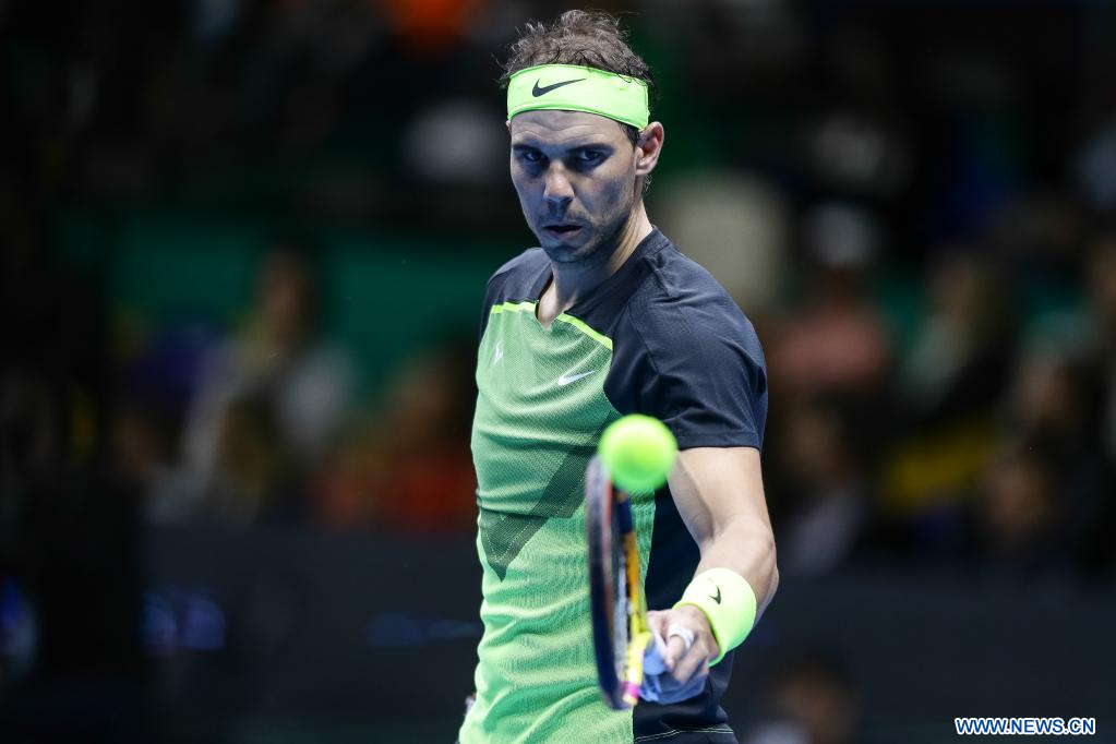 BOGOTA, 30 noviembre, 2022 (Xinhua) -- Imagen del 29 de noviembre de 2022 de Rafael Nadal, de España, recibiendo una pelota durante un partido de exhibición ante Casper Ruud, de Noruega, en el Coliseo Live, en la ciudad de Bogotá, capital de Colombia. (Xinhua/Jhon Paz)