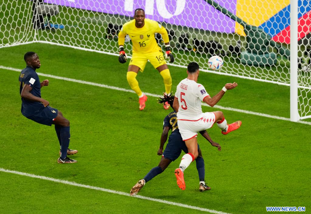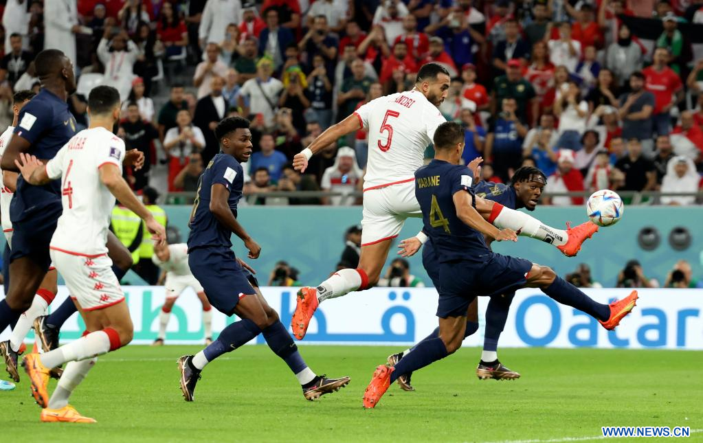 AL RAYYAN, 30 noviembre, 2022 (Xinhua) -- Nader Ghandri (3-d), de Túnez, disputa el balón durante el partido correspondiente al Grupo D entre Túnez y Francia en la Copa Mundial de la FIFA 2022, en el Estadio Ciudad de la Educación, en Al Rayyan, Qatar, el 30 de noviembre de 2022. (Xinhua/Han Yan)