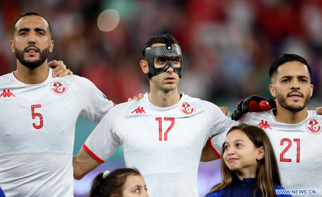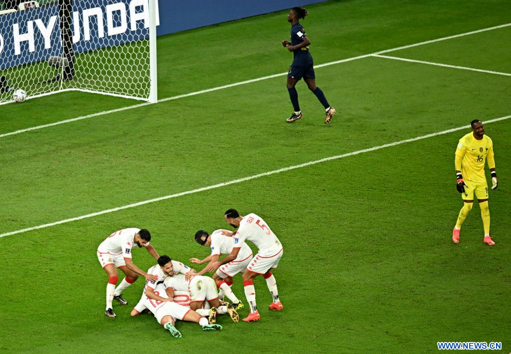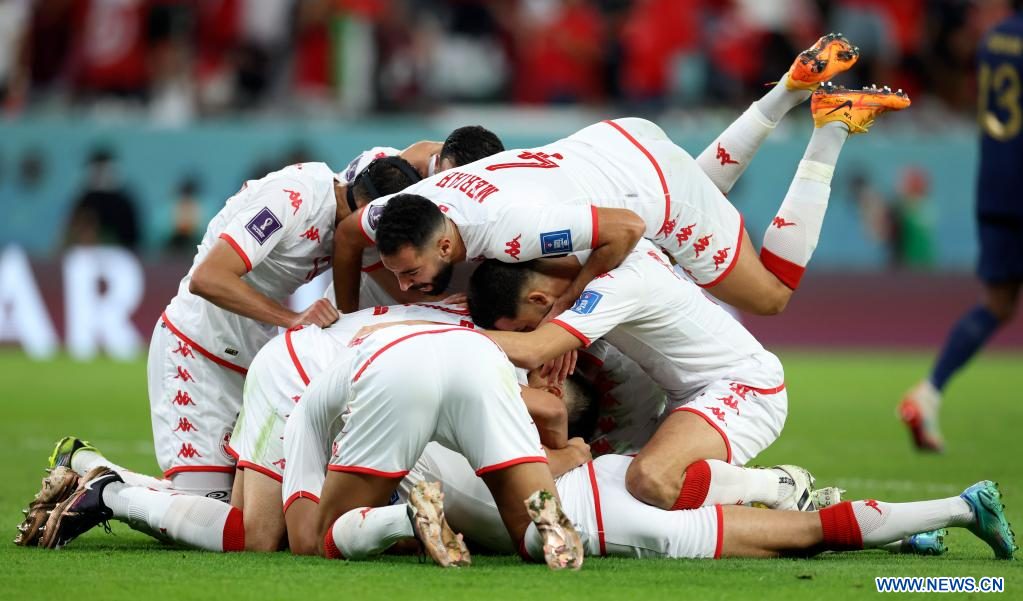 AL RAYYAN, 30 noviembre, 2022 (Xinhua) -- Jugadores de Túnez festejan una anotación de Wahbi Khazri durante el partido correspondiente al Grupo D entre Túnez y Francia en la Copa Mundial de la FIFA 2022, en el Estadio Ciudad de la Educación, en Al Rayyan, Qatar, el 30 de noviembre de 2022. (Xinhua/Xiao Yijiu)