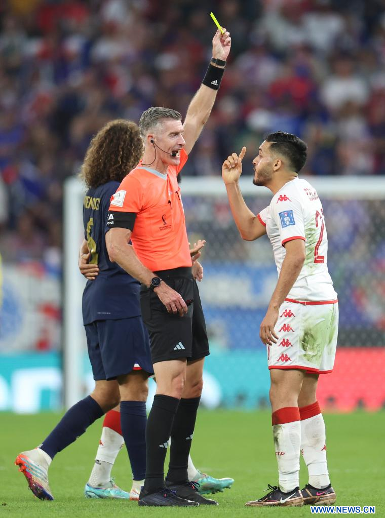 AL RAYYAN, 30 noviembre, 2022 (Xinhua) -- El árbitro Matthew Conger (2-d) muestra una tarjeta amarilla a Wajdi Kechrida (d), de Túnez, durante el partido correspondiente al Grupo D entre Túnez y Francia en la Copa Mundial de la FIFA 2022, en el Estadio Ciudad de la Educación, en Al Rayyan, Qatar, el 30 de noviembre de 2022. (Xinhua/Li Ming)