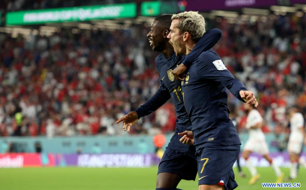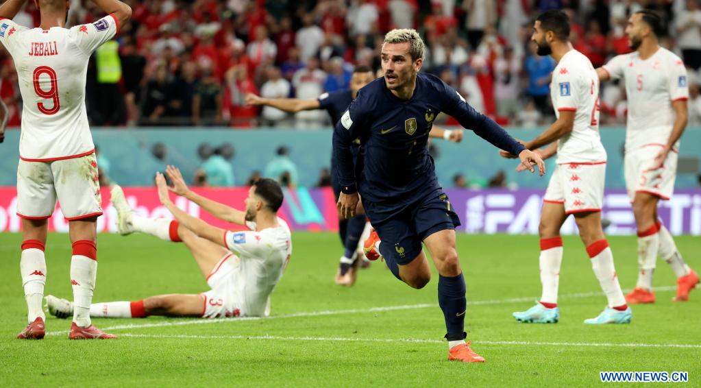 AL RAYYAN, 30 noviembre, 2022 (Xinhua) -- Antoine Griezmann (d), de Francia, festeja una anotación que luego es anulada por fuera de lugar durante el partido correspondiente al Grupo D entre Túnez y Francia en la Copa Mundial de la FIFA 2022, en el Estadio Ciudad de la Educación, en Al Rayyan, Qatar, el 30 de noviembre de 2022. (Xinhua/Han Yan)