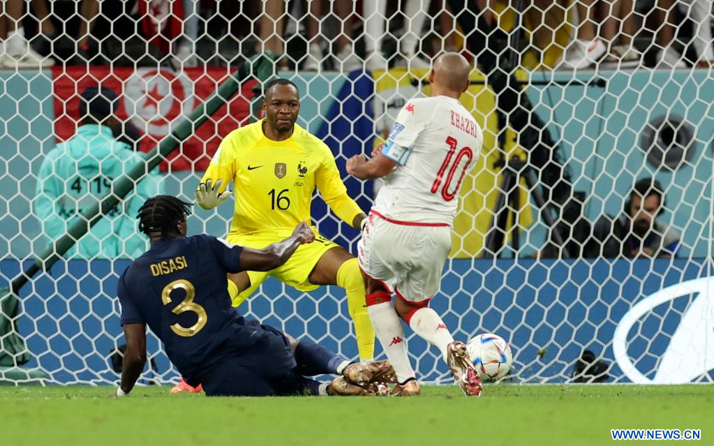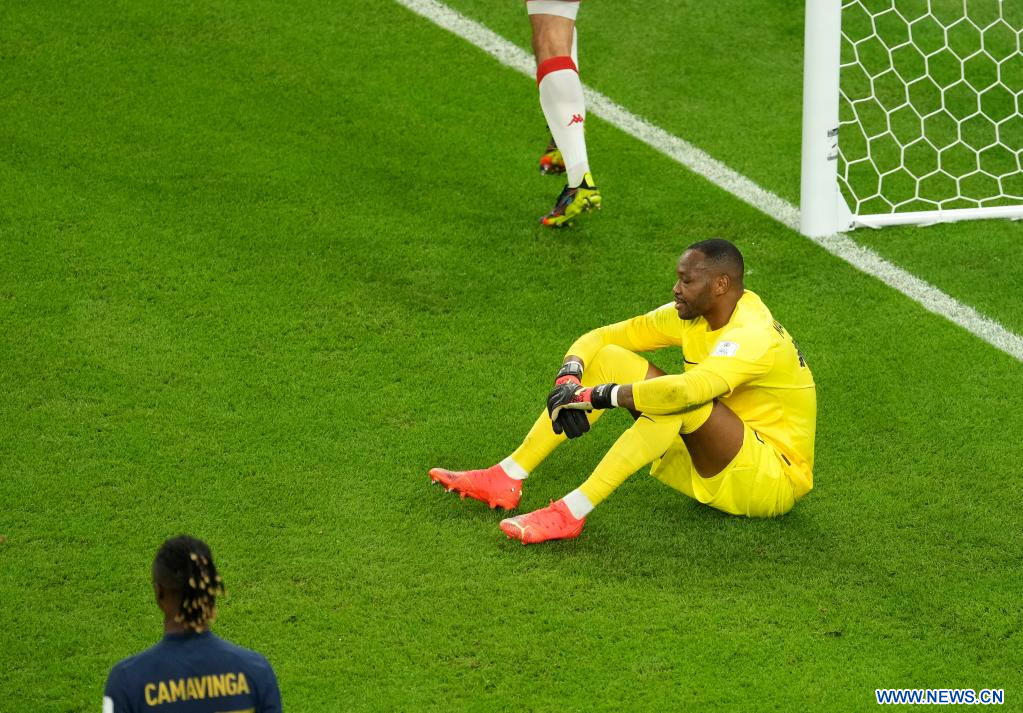 AL RAYYAN, 30 noviembre, 2022 (Xinhua) -- Steve Mandanda, guardameta de Francia, reacciona luego de que Nader Ghandri, de Túnez, realizara una anotación que posteriormente es anulada por fuera de lugar durante el partido correspondiente al Grupo D entre Túnez y Francia en la Copa Mundial de la FIFA 2022, en el Estadio Ciudad de la Educación, en Al Rayyan, Qatar, el 30 de noviembre de 2022. (Xinhua/Xiao Yijiu)