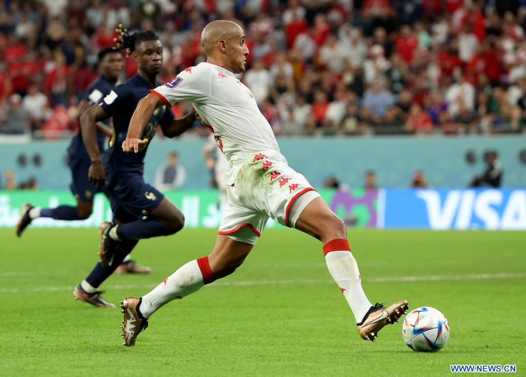 AL RAYYAN, 30 noviembre, 2022 (Xinhua) -- Nader Ghandri (d), de Túnez, dispara durante el partido correspondiente al Grupo D entre Túnez y Francia en la Copa Mundial de la FIFA 2022, en el Estadio Ciudad de la Educación, en Al Rayyan, Qatar, el 30 de noviembre de 2022. (Xinhua/Chen Cheng)
