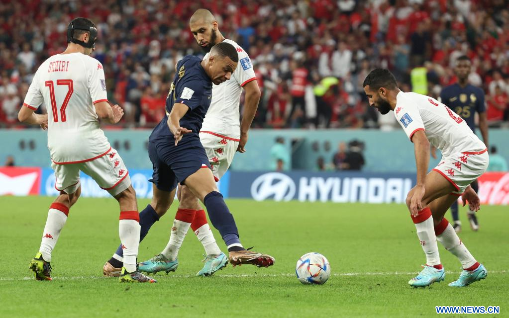 AL RAYYAN, 30 noviembre, 2022 (Xinhua) -- Kylian Mbappe (2-i), de Francia, disputa el balón durante el partido correspondiente al Grupo D entre Túnez y Francia en la Copa Mundial de la FIFA 2022, en el Estadio Ciudad de la Educación, en Al Rayyan, Qatar, el 30 de noviembre de 2022. (Xinhua/Han Yan)