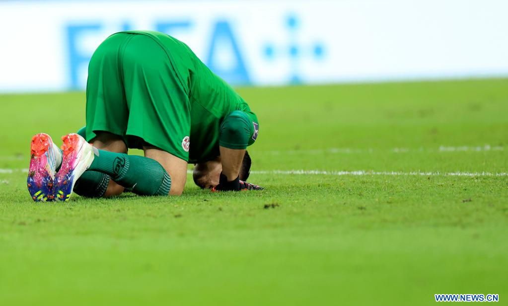 AL RAYYAN, 30 noviembre, 2022 (Xinhua) -- Aymen Dahmen, guardameta de Túnez, besa el césped durante el partido correspondiente al Grupo D entre Túnez y Francia en la Copa Mundial de la FIFA 2022, en el Estadio Ciudad de la Educación, en Al Rayyan, Qatar, el 30 de noviembre de 2022. (Xinhua/Li Ming)