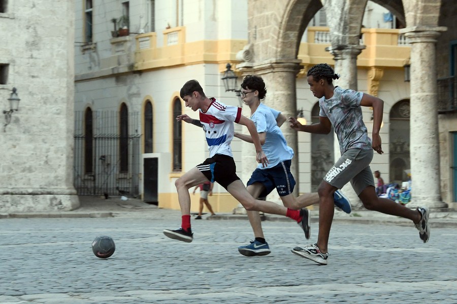 Jóvenes juegan fútbol en una Plaza de la Habana Vieja, en La Habana, capital de Cuba, el 1 de diciembre de 2022. Contaminados con la fiebre global del fútbol, los cubanos viven estos días con pasión el Mundial de Qatar 2022 y miles de personas siguen en la isla con atención el torneo, a pesar de que la única incursión mundialista de Cuba fue hace casi un siglo y de que el béisbol sigue como el deporte nacional. (Xinhua/Joaquín Hernández)