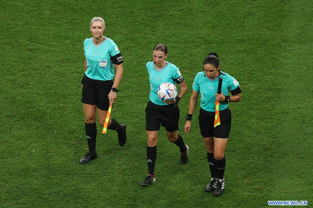 AL KHOR, 1 diciembre, 2022 (Xinhua) -- La árbitro Stephanie Frappart (c), y las árbitros asistentes Neuza Ines Back (i), y Karen Díaz Medina, caminan por el terreno de juego durante el partido correspondiente al Grupo E entre Costa Rica y Alemania en la Copa Mundial de la FIFA 2022, en el Estadio Al Bayt, en Al Khor, Qatar, el 1 de diciembre de 2022. Este partido se convierte en el primer juego en una Copa Mundial masculina en ser arbitrado por un equipo de árbitros exclusivamente femenino. (Xinhua/Pan Yulong)