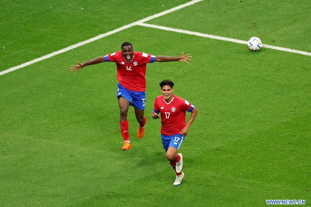 AL KHOR, 1 diciembre, 2022 (Xinhua) -- Yeltsin Tejeda (d), de Costa Rica, festeja después de anotar durante el partido correspondiente al Grupo E entre Costa Rica y Alemania en la Copa Mundial de la FIFA 2022, en el Estadio Al Bayt, en Al Khor, Qatar, el 1 de diciembre de 2022. (Xinhua/Pan Yulong)