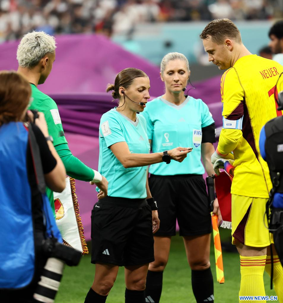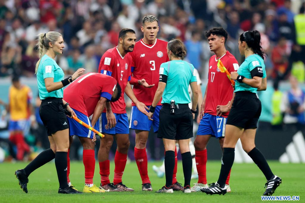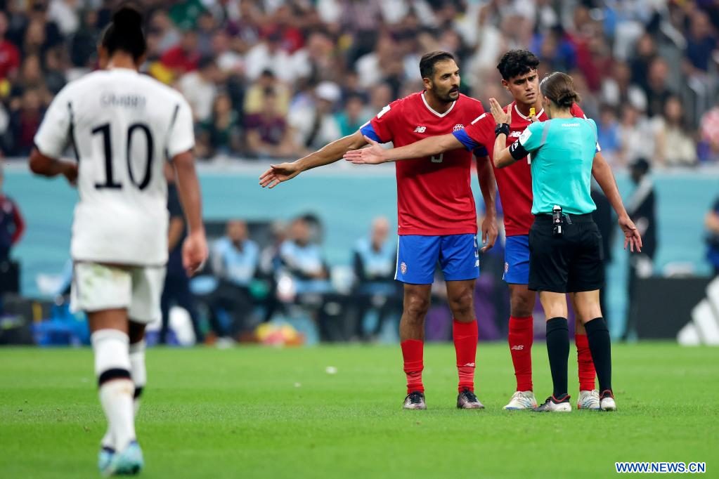 AL KHOR, 1 diciembre, 2022 (Xinhua) -- Jugadores de Costa Rica y la árbitro Stephanie Frappart reaccionan durante el partido correspondiente al Grupo E entre Costa Rica y Alemania en la Copa Mundial de la FIFA 2022, en el Estadio Al Bayt, en Al Khor, Qatar, el 1 de diciembre de 2022. (Xinhua/Li Ming)