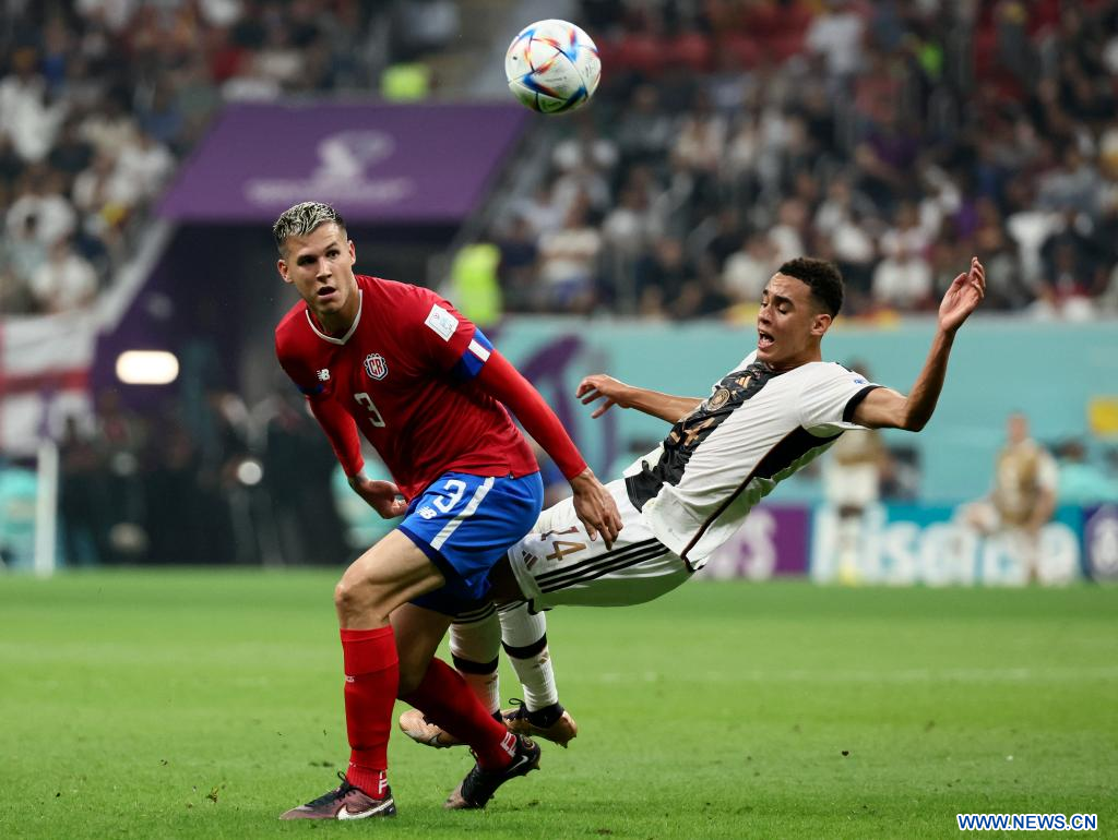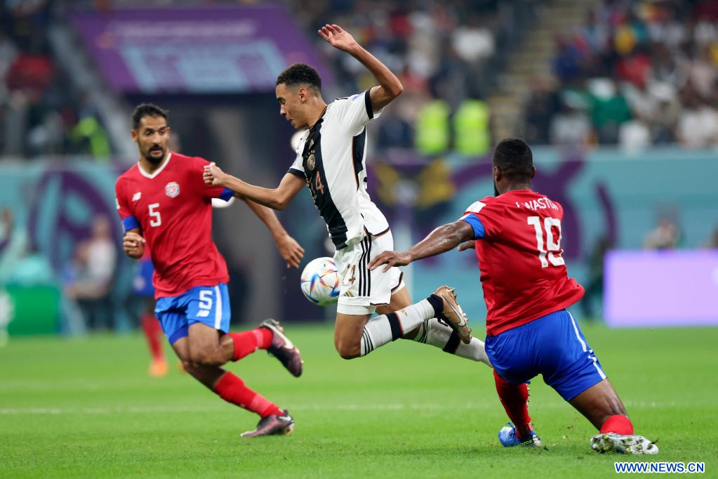 AL KHOR, 1 diciembre, 2022 (Xinhua) -- Jamal Musiala (c), de Alemania, compite durante el partido correspondiente al Grupo E entre Costa Rica y Alemania en la Copa Mundial de la FIFA 2022, en el Estadio Al Bayt, en Al Khor, Qatar, el 1 de diciembre de 2022. (Xinhua/Li Ming)