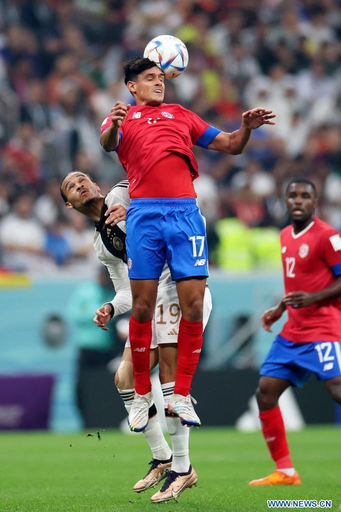 AL KHOR, 1 diciembre, 2022 (Xinhua) -- Yeltsin Tejeda (c), de Costa Rica, disputa el balón con Leroy Sane, de Alemania, durante el partido correspondiente al Grupo E entre Costa Rica y Alemania en la Copa Mundial de la FIFA 2022, en el Estadio Al Bayt, en Al Khor, Qatar, el 1 de diciembre de 2022. (Xinhua/Li Ming)