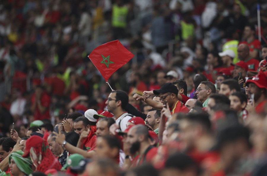 Aficionados animan previo al partido correspondiente a la semifinal entre Francia y Marruecos en la Copa Mundial de la FIFA 2022, en el Estadio Al Bayt, en Al Khor, Qatar, el 14 de diciembre de 2022. (Xinhua/Li Ming)