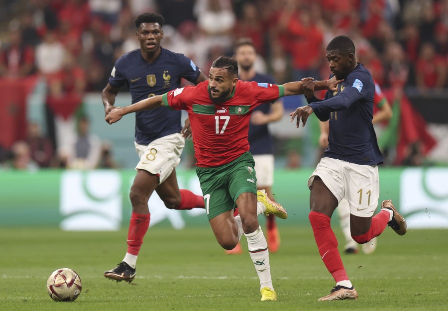 Sofiane Boufal (c), de Marruecos, compite durante la semifinal entre Francia y Marruecos en la Copa Mundial de la FIFA 2022, en el Estadio Al Bayt, en Al Khor, Qatar, el 14 de diciembre de 2022. (Xinhua/Cao Can)