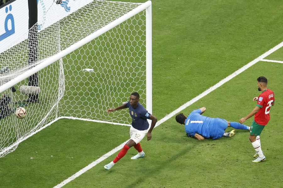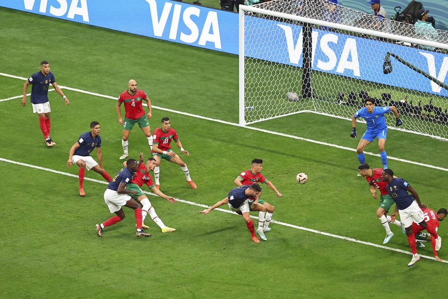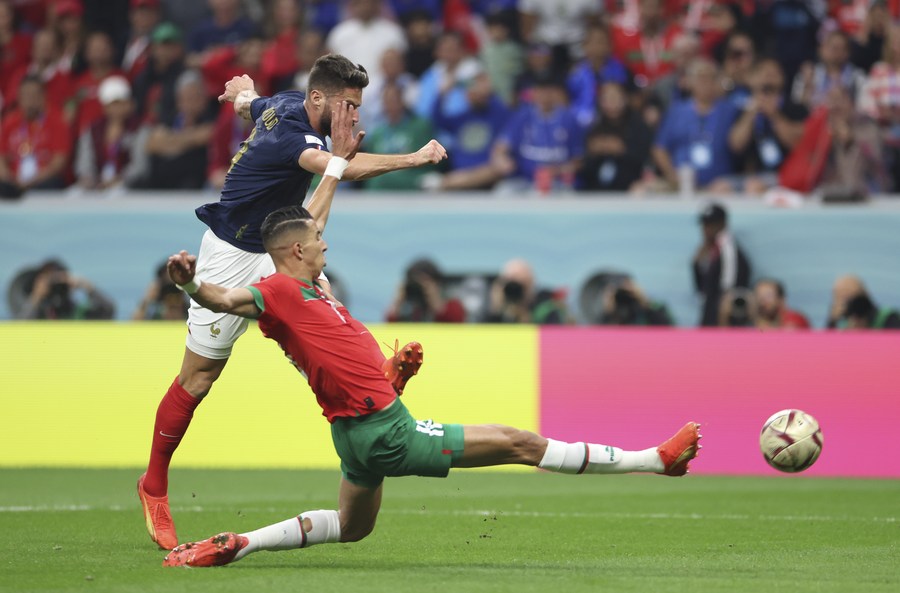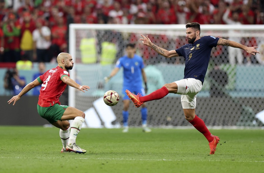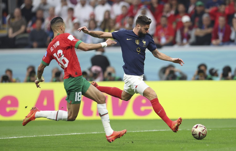 Olivier Giroud (d), de Francia, dispara durante el partido correspondiente a la semifinal entre Francia y Marruecos en la Copa Mundial de la FIFA 2022, en el Estadio Al Bayt, en Al Khor, Qatar, el 14 de diciembre de 2022. (Xinhua/Cao Can)