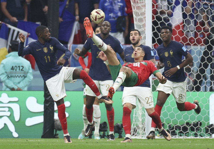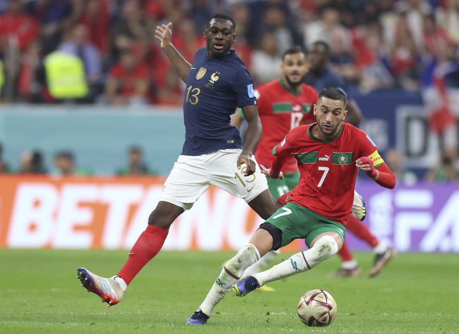 Youssouf Fofana (i), de Francia, disputa el balón con Hakim Ziyech, de Marruecos, durante la semifinal entre Francia y Marruecos en la Copa Mundial de la FIFA 2022, en el Estadio Al Bayt, en Al Khor, Qatar, el 14 de diciembre de 2022. (Xinhua/Li Ming)