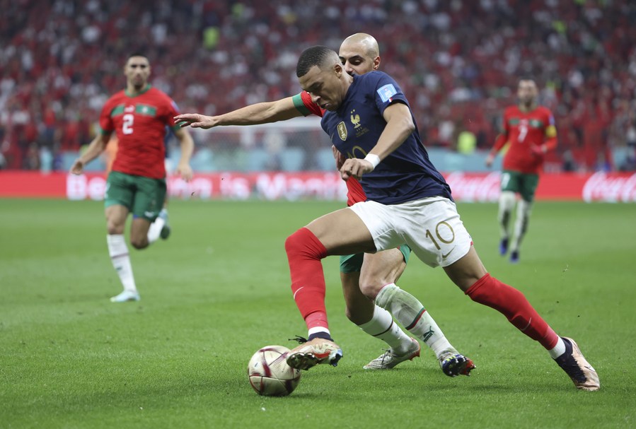 Kylian Mbappe (frente), de Francia, compite durante la semifinal entre Francia y Marruecos en la Copa Mundial de la FIFA 2022, en el Estadio Al Bayt, en Al Khor, Qatar, el 14 de diciembre de 2022. (Xinhua/Cao Can)