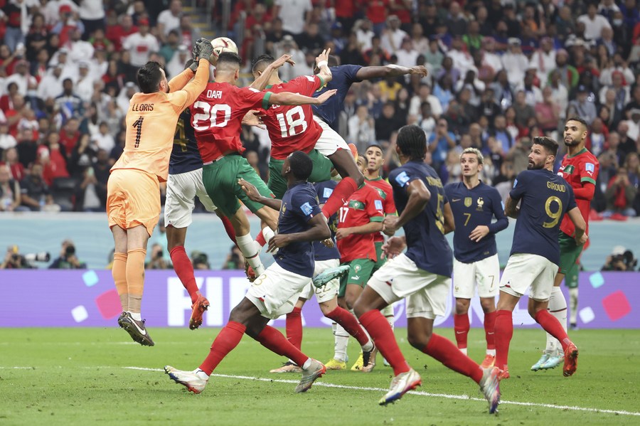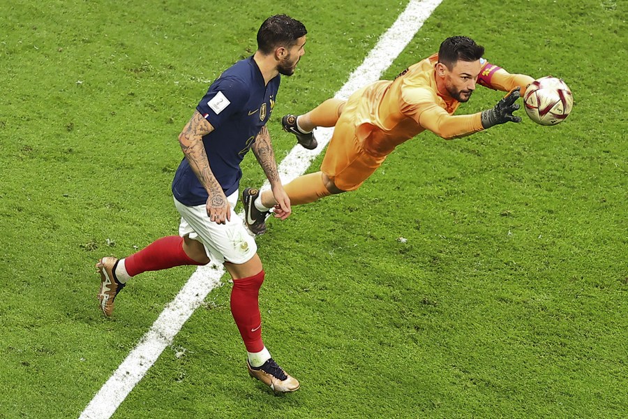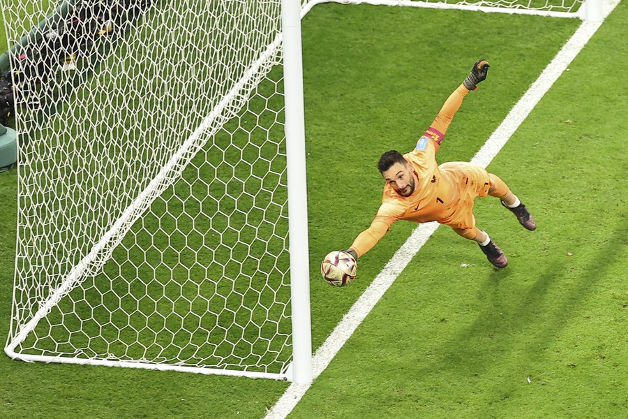 Hugo Lloris (d), guardameta de Francia, realiza una ataja durante la semifinal entre Francia y Marruecos en la Copa Mundial de la FIFA 2022, en el Estadio Al Bayt, en Al Khor, Qatar, el 14 de diciembre de 2022. (Xinhua/Ding Xu)