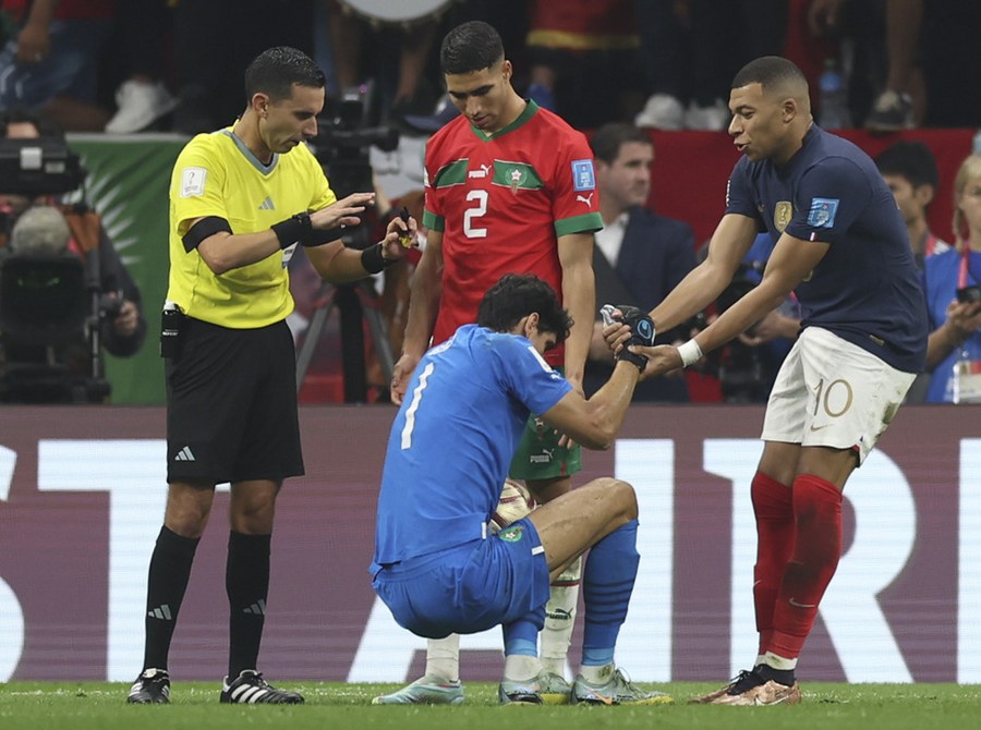 Kylian Mbappe (d), de Francia, ayuda a Yassine Bounou, guardameta de Marruecos, durante la semifinal entre Francia y Marruecos en la Copa Mundial de la FIFA 2022, en el Estadio Al Bayt, en Al Khor, Qatar, el 14 de diciembre de 2022. (Xinhua/Pan Yulong)