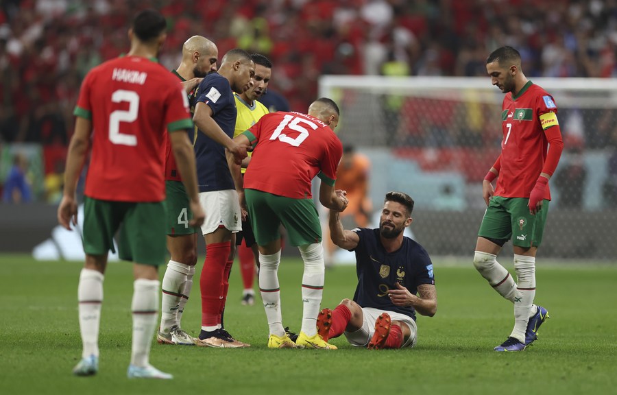Selim Amallah (3-d), de Marruecos, ayuda a Olivier Giroud, de Francia, durante el partido correspondiente a la semifinal entre Francia y Marruecos en la Copa Mundial de la FIFA 2022, en el Estadio Al Bayt, en Al Khor, Qatar, el 14 de diciembre de 2022. (Xinhua/Pan Yulong)