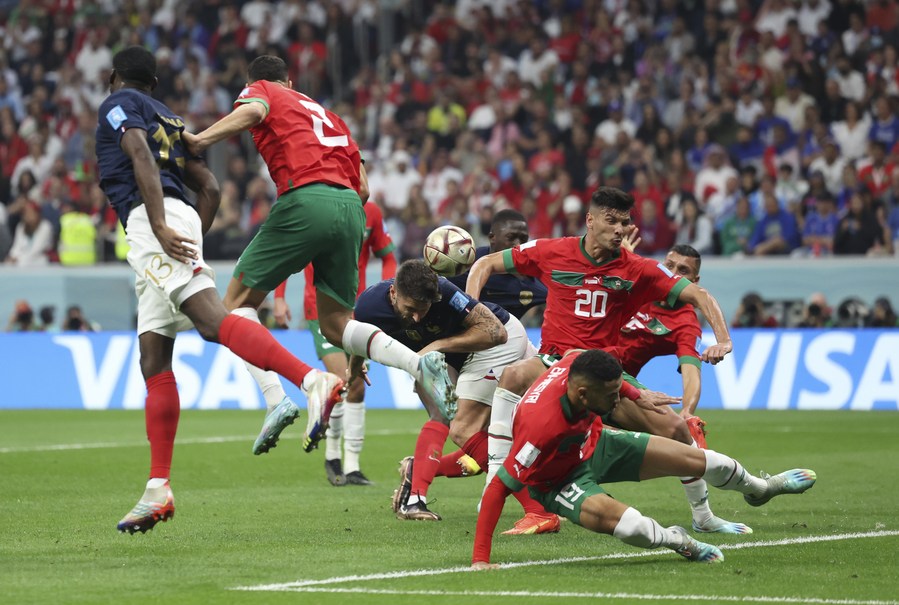 Olivier Giroud (3-i), de Francia, cabecea el balón durante la semifinal entre Francia y Marruecos en la Copa Mundial de la FIFA 2022, en el Estadio Al Bayt, en Al Khor, Qatar, el 14 de diciembre de 2022. (Xinhua/Li Ming)