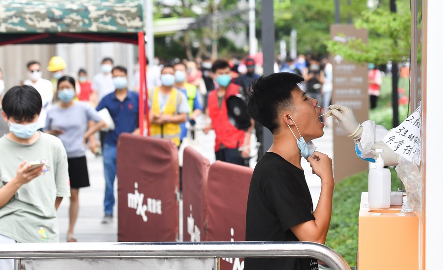 Un residente recibe una prueba de ácido nucleico en un sitio de pruebas, en el distrito de Longhua, en Haikou, en la provincia de Hainan, en el sur de China, el 7 de agosto de 2022. (Xinhua/Yang Guanyu)
