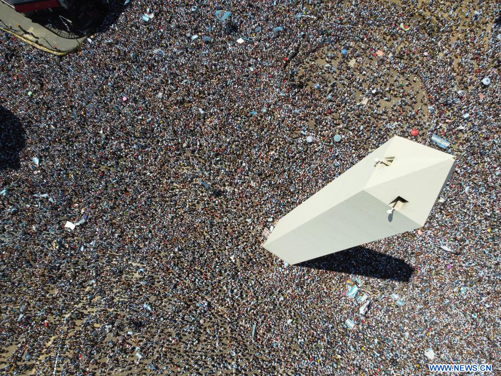 BUENOS AIRES, 20 diciembre, 2022 (Xinhua) -- Imagen tomada con un dron de aficionados argentinos esperando la llegada de los jugadores de Argentina para los festejos por la obtención del título de la Copa Mundial de la FIFA 2022, en Buenos Aires, Argentina, el 20 de diciembre de 2022. Una multitud se lanzó el martes a las calles de la ciudad argentina de Buenos Aires y sus adyacencias para recibir al seleccionado argentino de fútbol, flamante campeón del Mundial de Qatar 2022. (Xinhua/Martín Zabala)