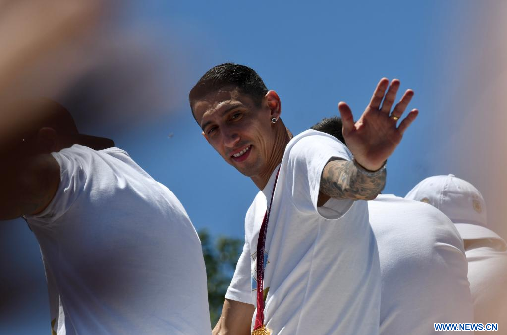 BUENOS AIRES, 20 diciembre, 2022 (Xinhua) -- Imagen proveída por la Agencia de Noticias Télam del jugador Angel di María, de Argentina, saludando durante una caravana como parte de los festejos por la obtención del título de la Copa Mundial de la FIFA 2022, en Buenos Aires, Argentina, el 20 de diciembre de 2022. Una multitud se lanzó el martes a las calles de la ciudad argentina de Buenos Aires y sus adyacencias para recibir al seleccionado argentino de fútbol, flamante campeón del Mundial de Qatar 2022. (Xinhua/Gustavo Amarelle/TELAM)