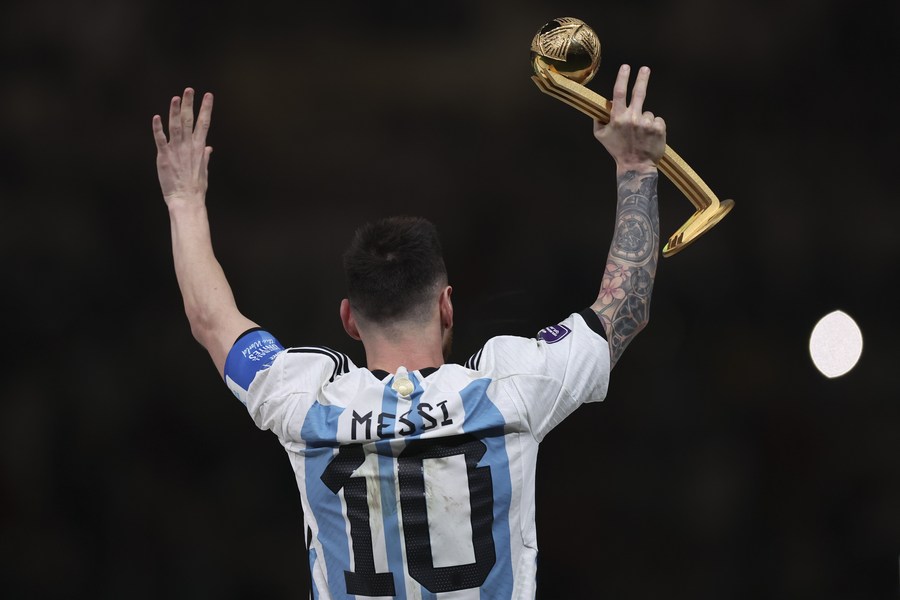 Lionel Messi, de Argentina, festeja su premio de balón de oro durante la ceremonia de premiación de la Copa Mundial de la FIFA 2022, en el Estadio Lusail, en Lusail, Qatar, el 18 de diciembre de 2022. (Xinhua/Cao Can)