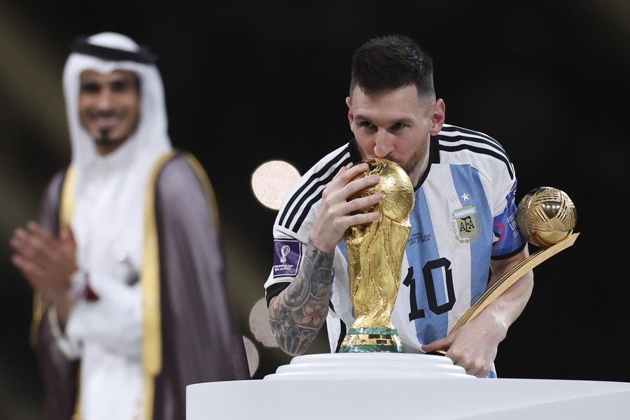Lionel Messi, de Argentina, besa el Trofeo de la Copa Mundial durante la ceremonia de premiación de la Copa Mundial de la FIFA 2022, en el Estadio Lusail, en Lusail, Qatar, el 18 de diciembre de 2022. (Xinhua/Li Ming)