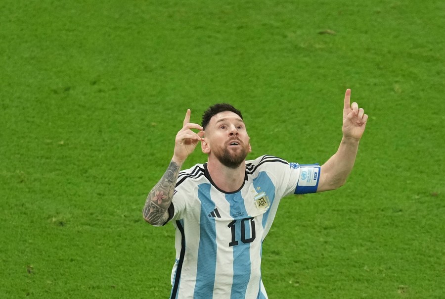 Lionel Messi, de Argentina, festeja su segunda anotación durante el partido correspondiente a la final entre Argentina y Francia en la Copa Mundial de la FIFA 2022, en el Estadio Lusail, en Lusail, Qatar, el 18 de diciembre de 2022. (Xinhua/Pan Yulong)