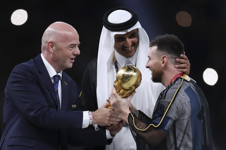 El presidente de la FIFA, Gianni Infantino (i) y el emir de Qatar, el jeque Tamim bin Hamad Al Thani (c), galardonan a Lionel Messi, de Argentina, durante la ceremonia de premiación de la Copa Mundial de la FIFA 2022, en el Estadio Lusail, en Lusail, Qatar, el 18 de diciembre de 2022. (Xinhua/Li Ming)