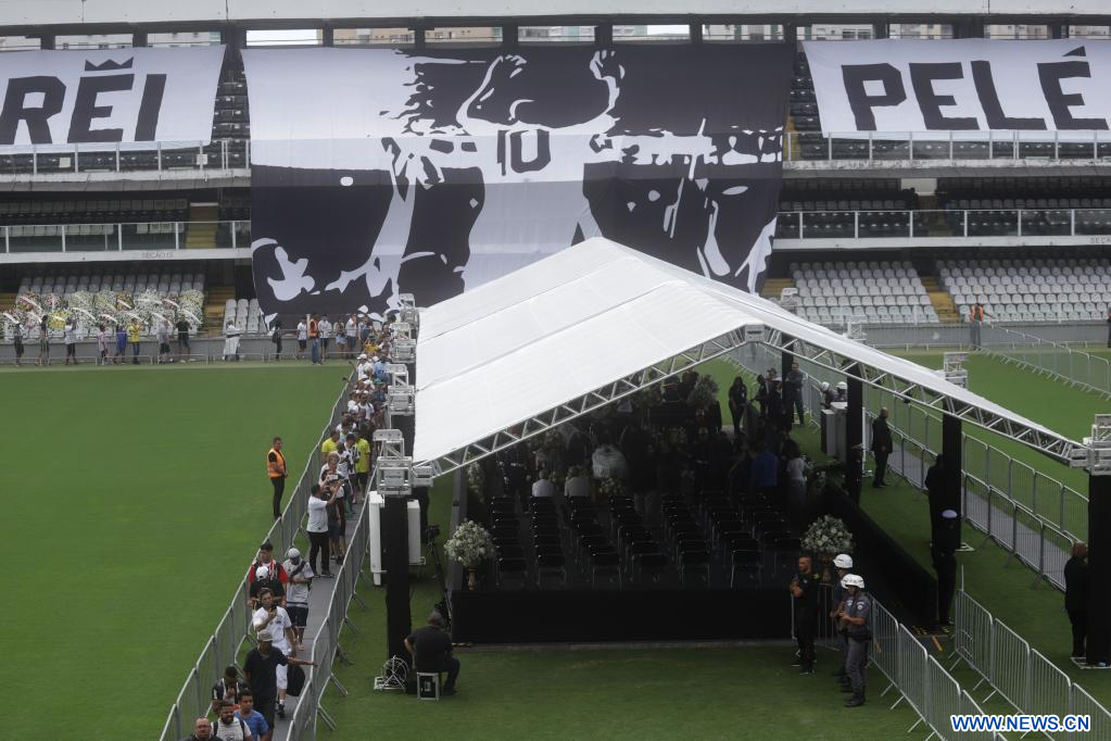 SAO PAULO, 2 enero, 2023 (Xinhua) -- El funeral del ex jugador de fútbol Edson Arantes do Nascimento, conocido como Pelé, se lleva a cabo en el Estadio de Vila Belmiro, en la ciudad de Santos, en el estado de Sao Paulo, Brasil, el 2 de enero de 2023. (Xinhua/Rahel Patrasso)