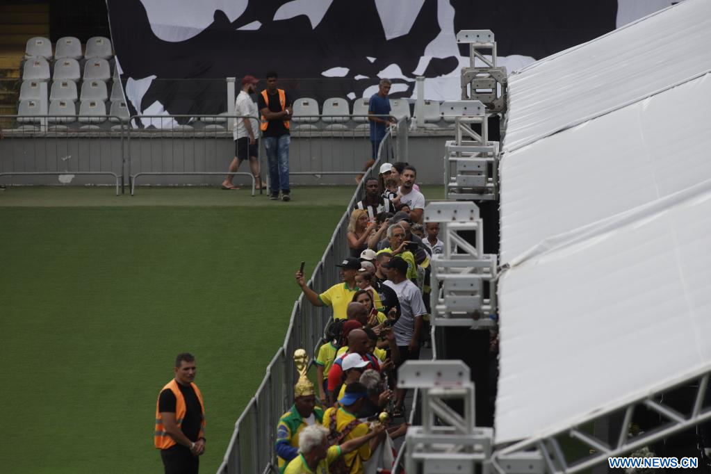 SAO PAULO, 2 enero, 2023 (Xinhua) -- Aficionados asisten al funeral del ex jugador de fútbol Edson Arantes do Nascimento, conocido como Pelé, en el Estadio de Vila Belmiro, en la ciudad de Santos, en el estado de Sao Paulo, Brasil, el 2 de enero de 2023. (Xinhua/Rahel Patrasso)
