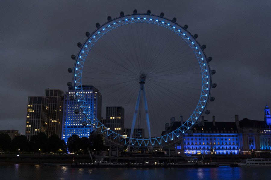 Imagen del 4 de julio de 2020 del "Ojo de Londres" iluminado con luz de color azul para conmemorar el 72 aniversario del Servicio Nacional de Salud (NHS, por sus siglas en inglés), en Londres, Reino Unido. (Xinhua/Ray Tang)