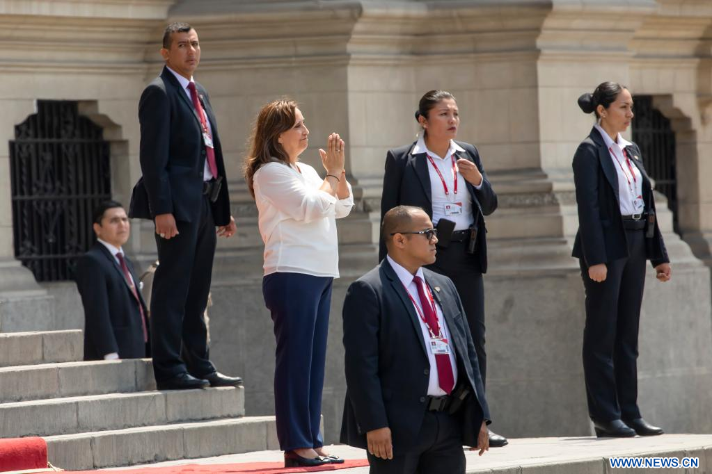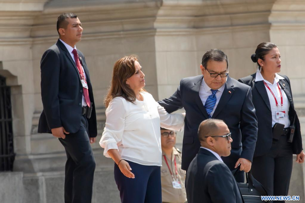 LIMA, 10 enero, 2023 (Xinhua) -- La presidenta peruana, Dina Boluarte (c), se despide del primer ministro de Perú, Alberto Otárola, y de otros integrantes del gabinete al salir del Palacio de Gobierno previo a dirigirse al Congreso y solicitar el voto de confianza, en Lima, Perú, el 10 de enero de 2023. (Xinhua/Mariana Bazo)