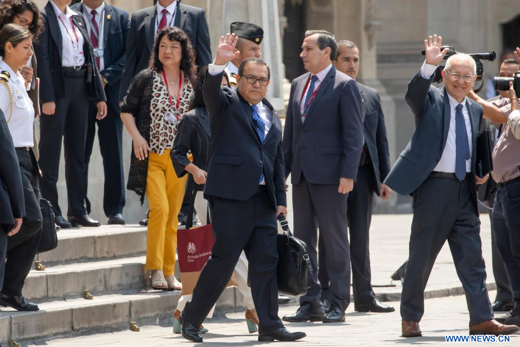 LIMA, 10 enero, 2023 (Xinhua) -- La presidenta peruana, Dina Boluarte (2-i), se despide mientras el primer ministro de Perú, Alberto Otárola (2-d) e integrantes del gabinete salen del Palacio de Gobierno para dirigirse al Congreso y solicitar el voto de confianza, en Lima, Perú, el 10 de enero de 2023. (Xinhua/Mariana Bazo)