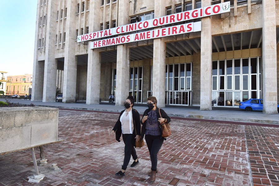 Mujeres caminan frente al Hospital Clínico Quirúrgico Hermanos Ameijeiras, en La Habana, capital de Cuba, el 17 de enero de 2022. (Xinhua/Joaquín Hernández)