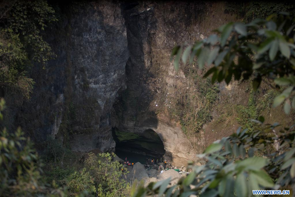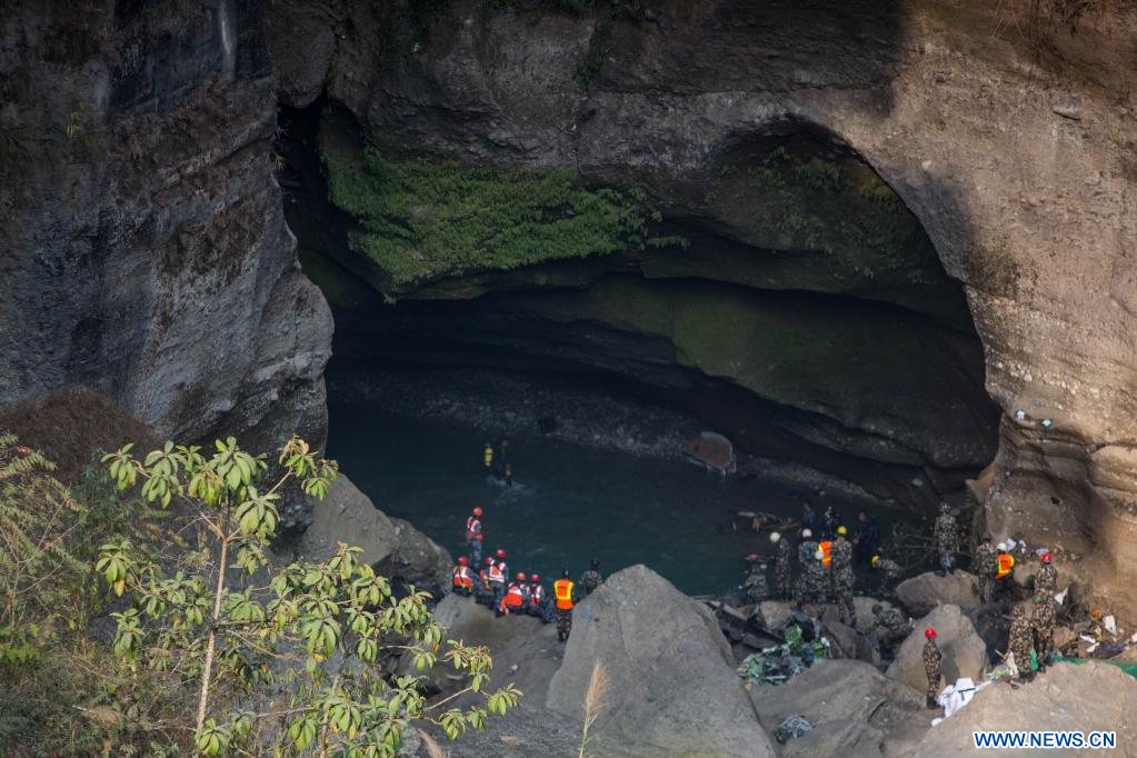 POKHARA, 17 enero, 2023 (Xinhua) -- Rescatistas son vistos en el sitio del accidente de un avión de pasajeros, cerca de Pokhara, Nepal, el 17 de enero de 2023. Con el hallazgo el martes del segundo cuerpo en el sitio de la caída de un avión de pasajeros nepalés en el centro de Nepal se han recuperado 71 cuerpos en total y se espera la confirmación de la última víctima desaparecida, dijo un funcionario. Un avión de Yeti Airlines se estrelló el domingo en el barranco del río Seti cerca de la ciudad de Pokhara cuando volaba de Katmandú rumbo a Pokhara con 72 personas a bordo. (Xinhua/Sulav Shrestha)