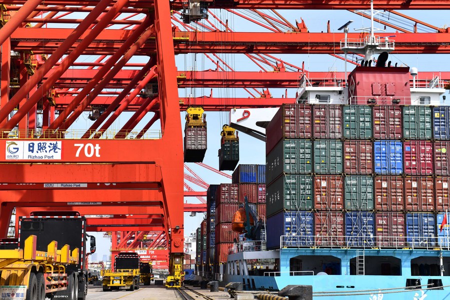 Imagen del 28 de marzo de 2022 de camiones esperando a ser cargados con contenedores, en una terminal de contenedores en Rizhao, en la provincia de Shandong, en el este de China. (Xinhua/Guo Xulei)